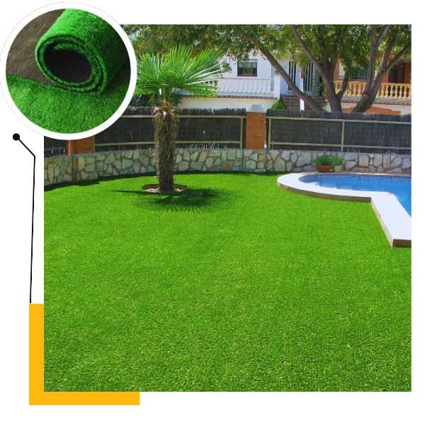Versatile green shades and custom pile height make a fantastic ambience. Desired thickness and heavy-duty underlayment provide superior comfort. Our uniquely designed grass features an eye-catching texture that looks like real grass.